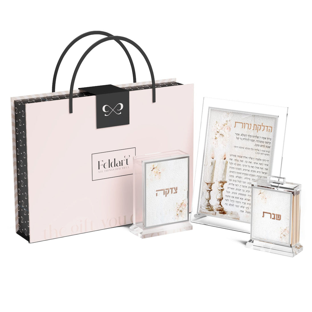 Indulge in luxury with our Leatherite Blush Rose Hadlakos Neiros Gift Box Set. This stunning gift set is perfect for any woman and includes a stunning leatherite blush rose hadlakos neiros card, tzedakah box, and match holder. Elevate your gift-giving and make someone's day with this beautiful set.