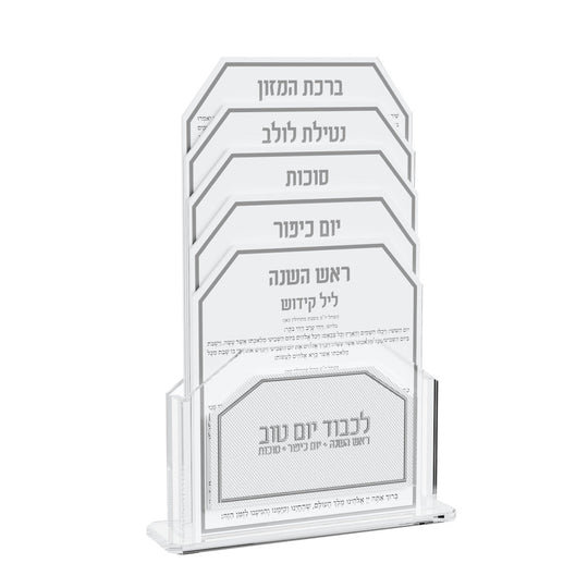 The ultimate gift! A set of four cards in a practical holder. Set contains cards for Shabbos Kiddush, Shalom Aleicheim & EIshes Chayil, Yom Tov Kiddush and Havdalah.Each acrylic card is topped with a gorgeous metallic...Regular price £39.00 -